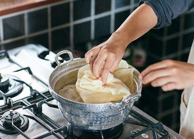 The Nara craft "Kayaori" is a thin, open-woven fabric used for mosquito nets that was introduced to Japan during the Nara period. The dish towel is made of five layers of cotton kaya-woven fabric sewn together and becomes softer the more you use it.