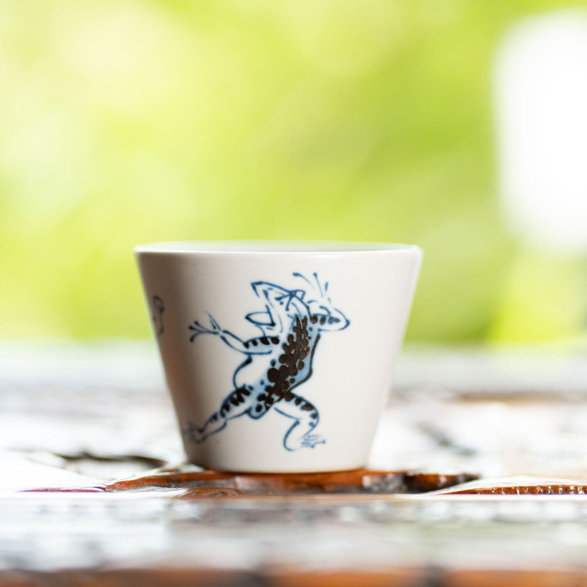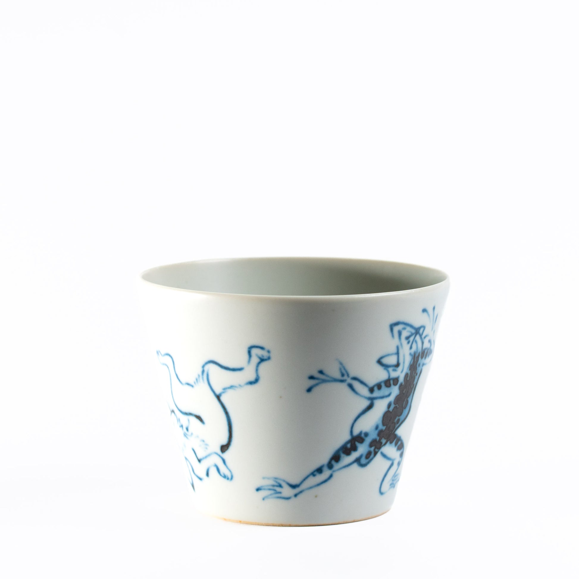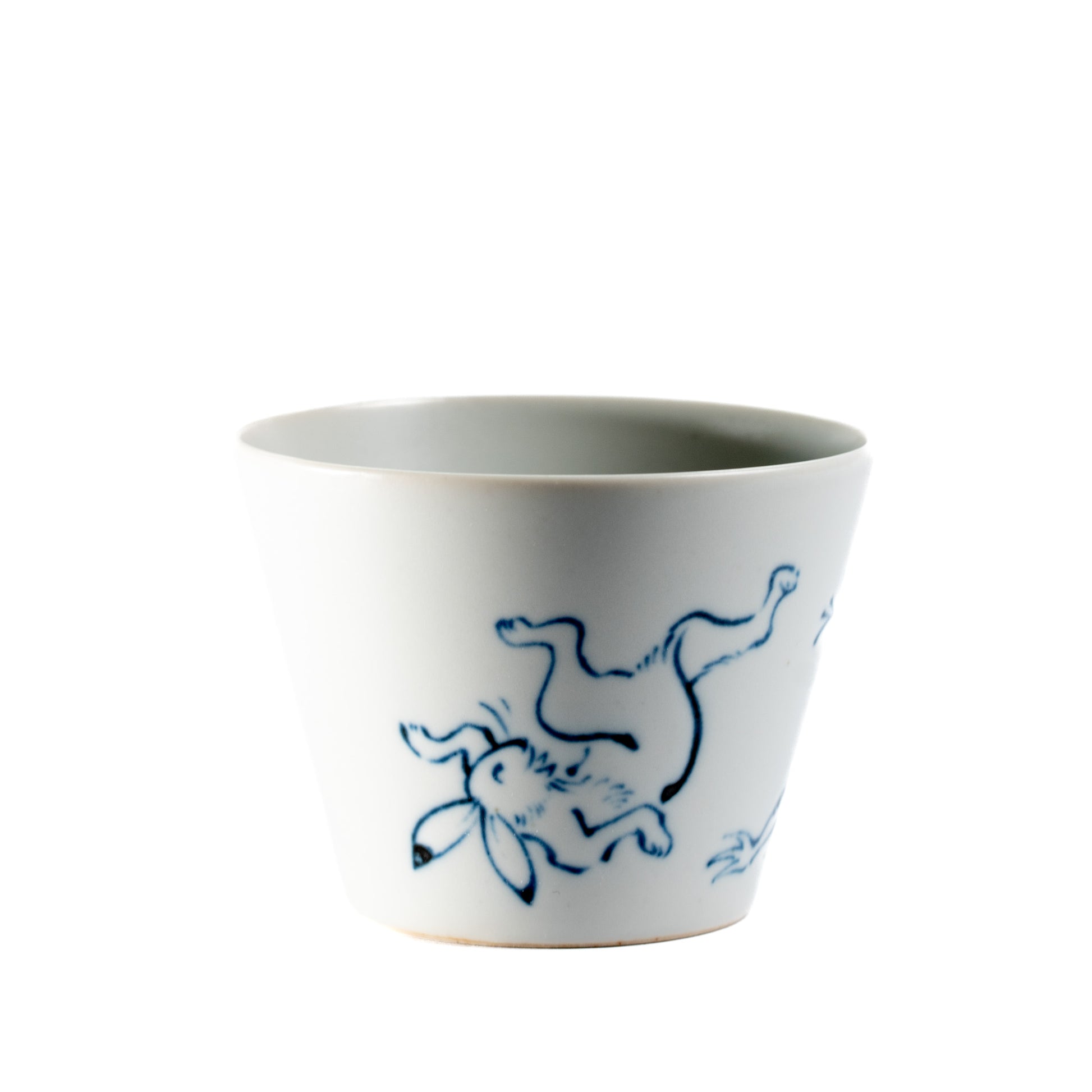 An encapsulation of carefully chosen moments from the Chojugiga picture scrolls, often hailed as Japan's oldest manga. The design employs a technique known as "copperplate transfer," a method prevalent in painting Hasami ware during the Meiji and Taisho eras. This approach involves applying ceramic paints onto washi paper and then transferring them onto the pottery surface.