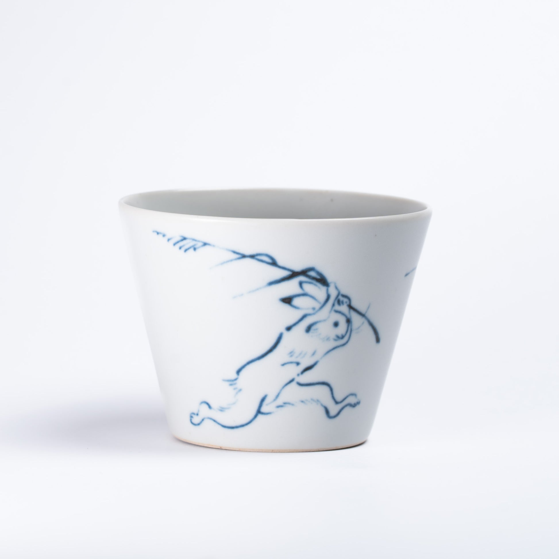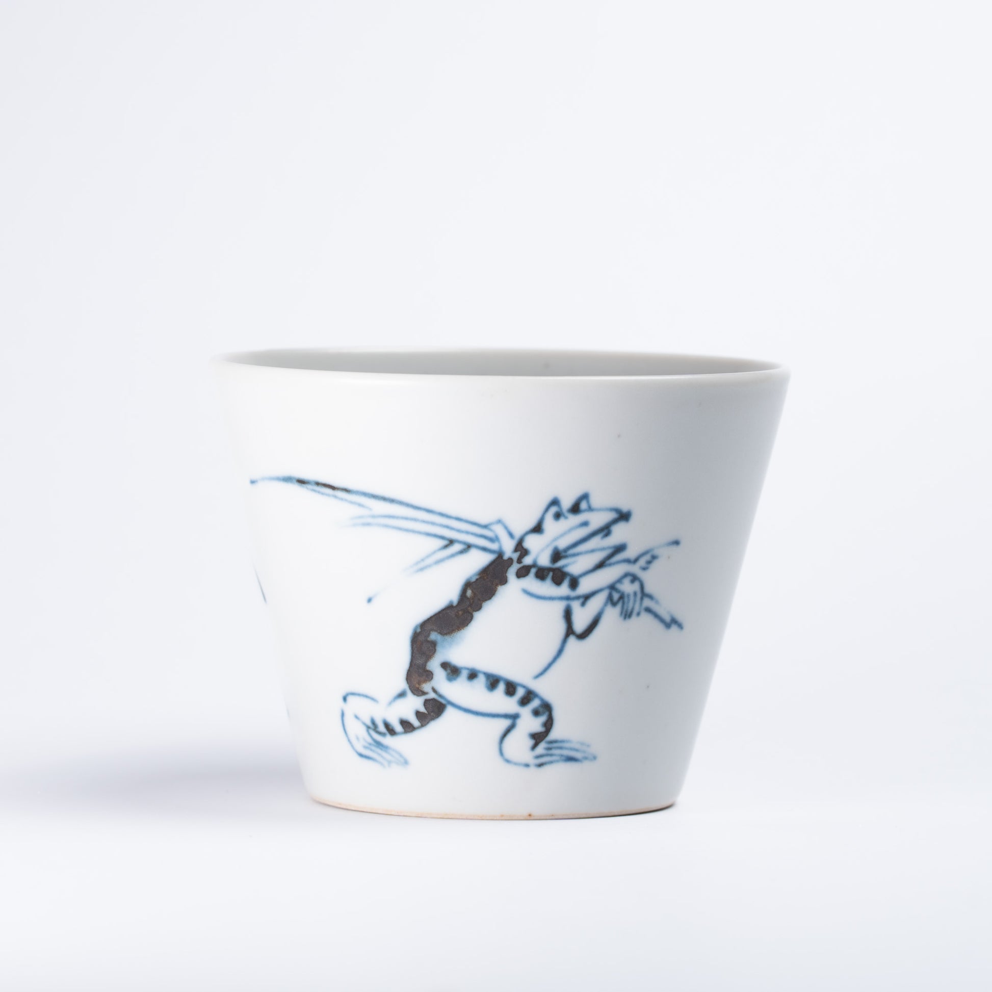 An encapsulation of carefully chosen moments from the Chojugiga picture scrolls, often hailed as Japan's oldest manga. The design employs a technique known as "copperplate transfer," a method prevalent in painting Hasami ware during the Meiji and Taisho eras. This approach involves applying ceramic paints onto washi paper and then transferring them onto the pottery surface.