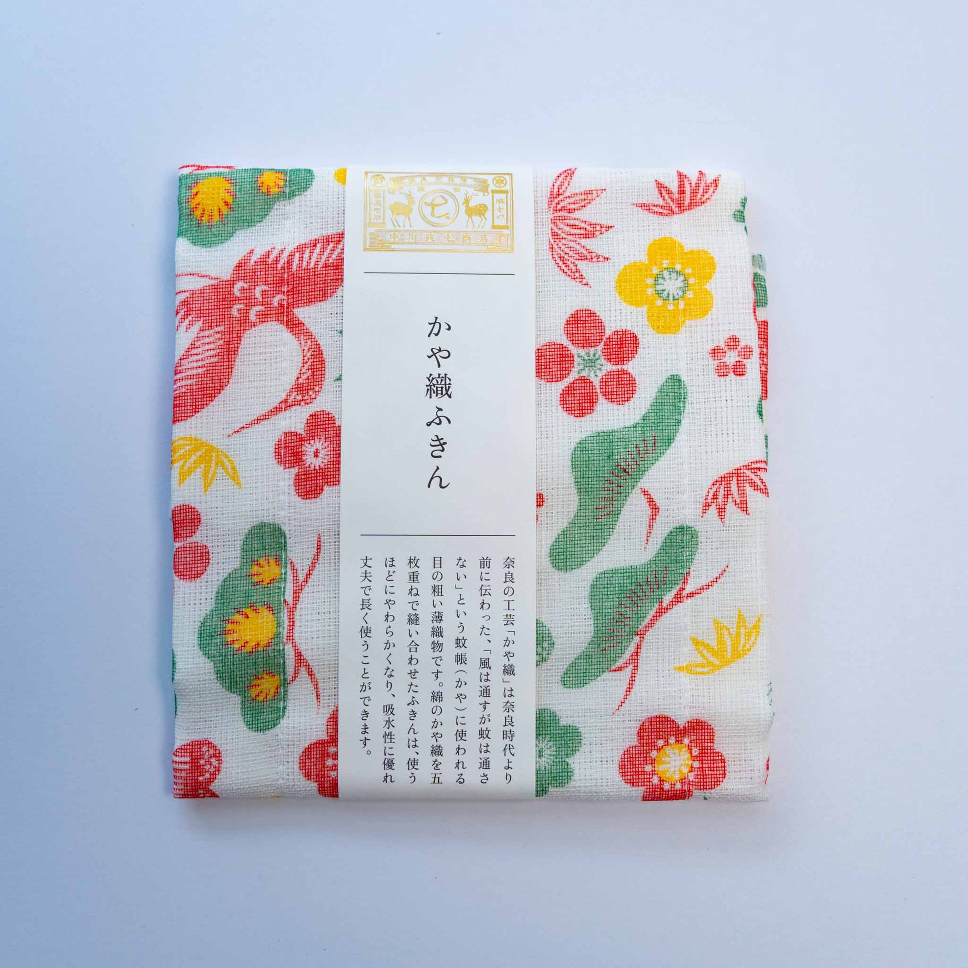 The Nara craft ``Kayaori'' is a thin, open-woven fabric used for mosquito nets that was introduced to Japan during the Nara period and is said to allow wind to pass through but keep mosquitoes out. The dish towel is made of five layers of cotton kaya-woven fabric sewn together and becomes softer the more you use it.