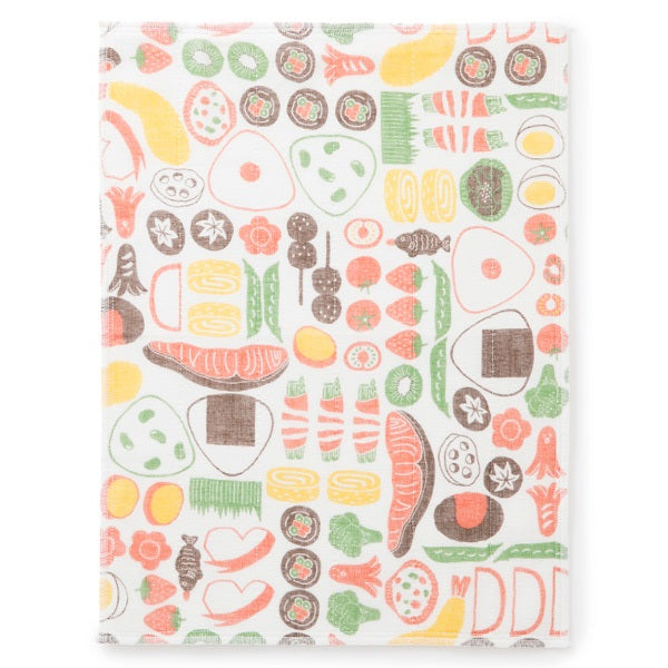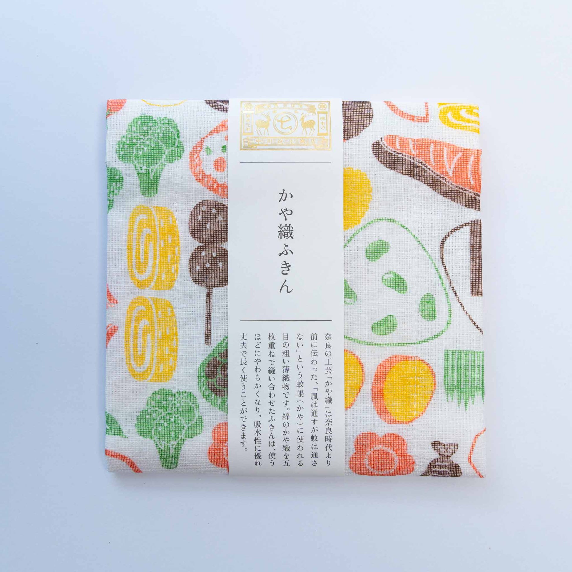 Kayaori dish towels are made from mosquito net fabric with motifs of seasonal delicacies. The dish towels have the theme of a bento box perfect for the tourist season, with colorful illustrations of standard side dishes such as rice balls, tamagoyaki, sausages, salmon, fried shrimp, and strawberries.