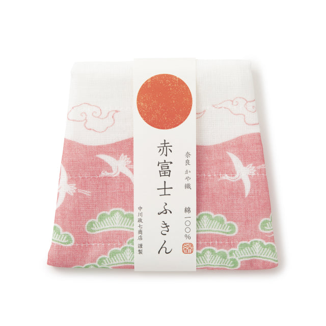 Introducing our unique Fuji Dish Towel crafted from high-quality mosquito net fabric, elegantly folded to resemble Japan's iconic Mt. Fuji. Emblazoned with the auspicious motifs of cranes, turtles, and pine trees, this Red Fuji design symbolizes good luck and blessings